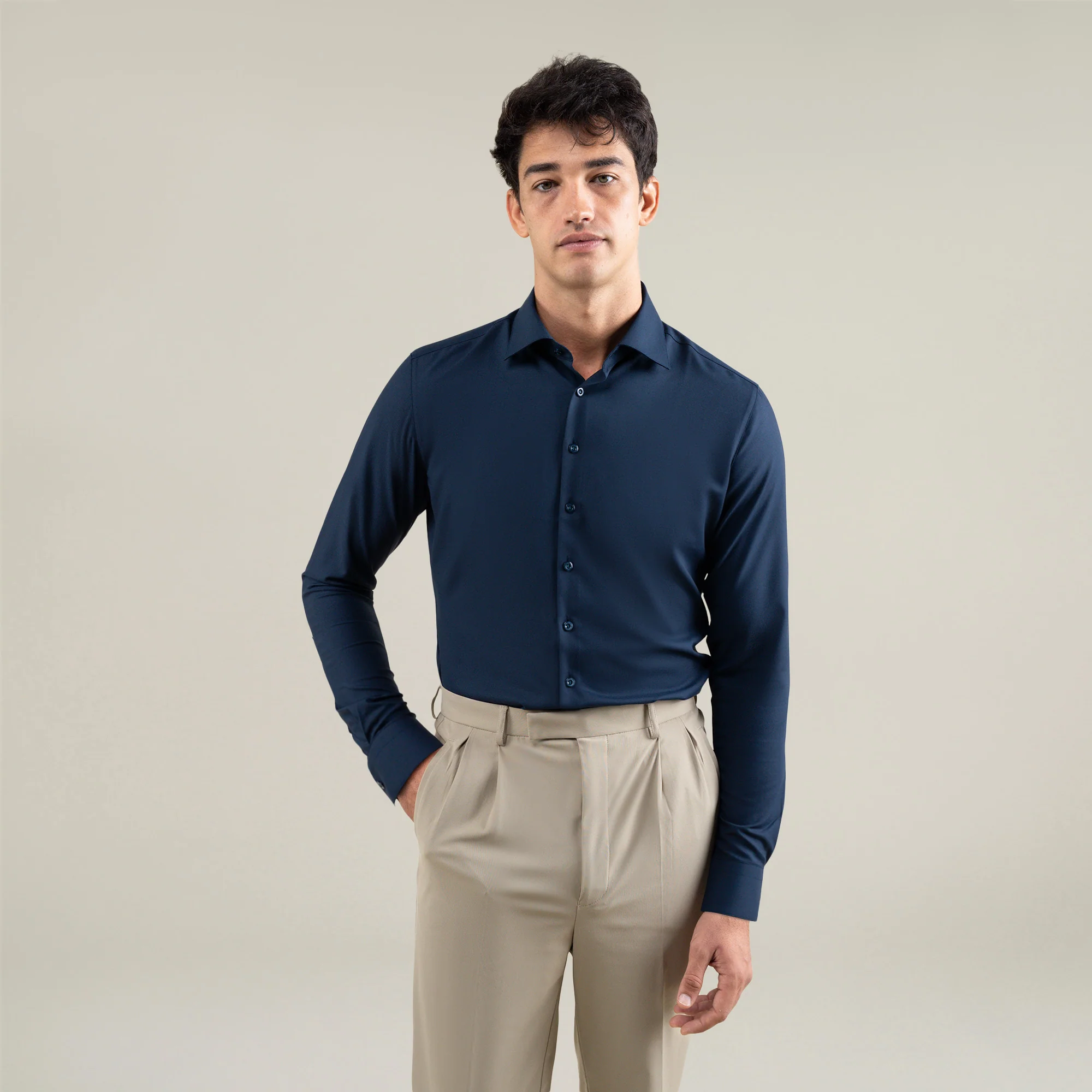 The spread shirt combines the timeless English spread collar with technical fabric.